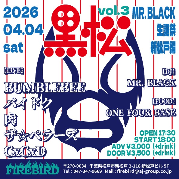 【LIVE】 18:00- BUMBLEBEE 18:45- バイドク 19:30- 肉 20:15- ザ☆ペラーズ 21:00- CxCxD 【DJ】 MR. BLACK 【FOOD】 ONE four BASE